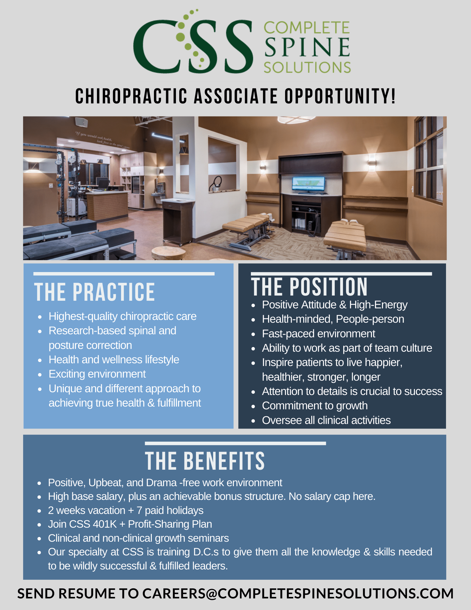 If interested in this leadership position, please email your resume/cover letter and contact info to RE*****@******c1.com if you are ready to change the world! For more info, go to https://www.completespinesolutions.com/chiropractic-careers/
