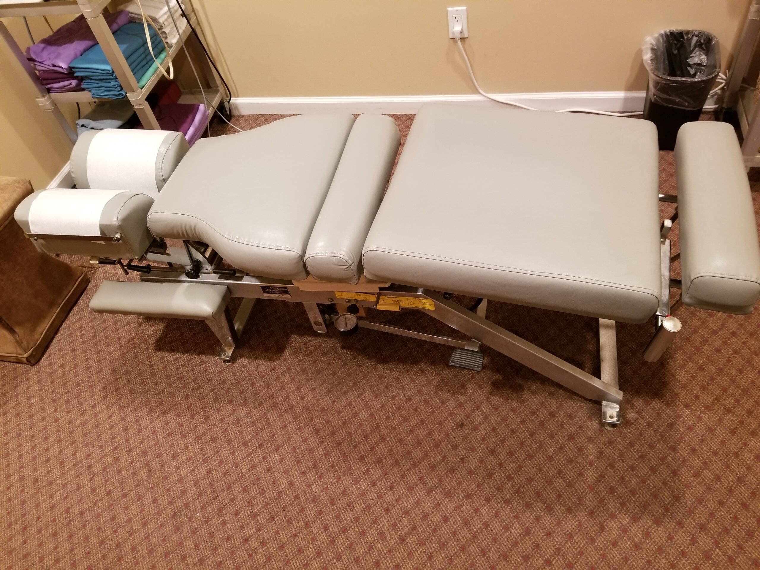 Used chiropractic table, functioning & in reasonable condition – may need small repairs, including left face rest cover which has a small tear. All pieces operate as they are supposed to. The table is 23″ high from floor, and 64″ long with the footrest retracted.