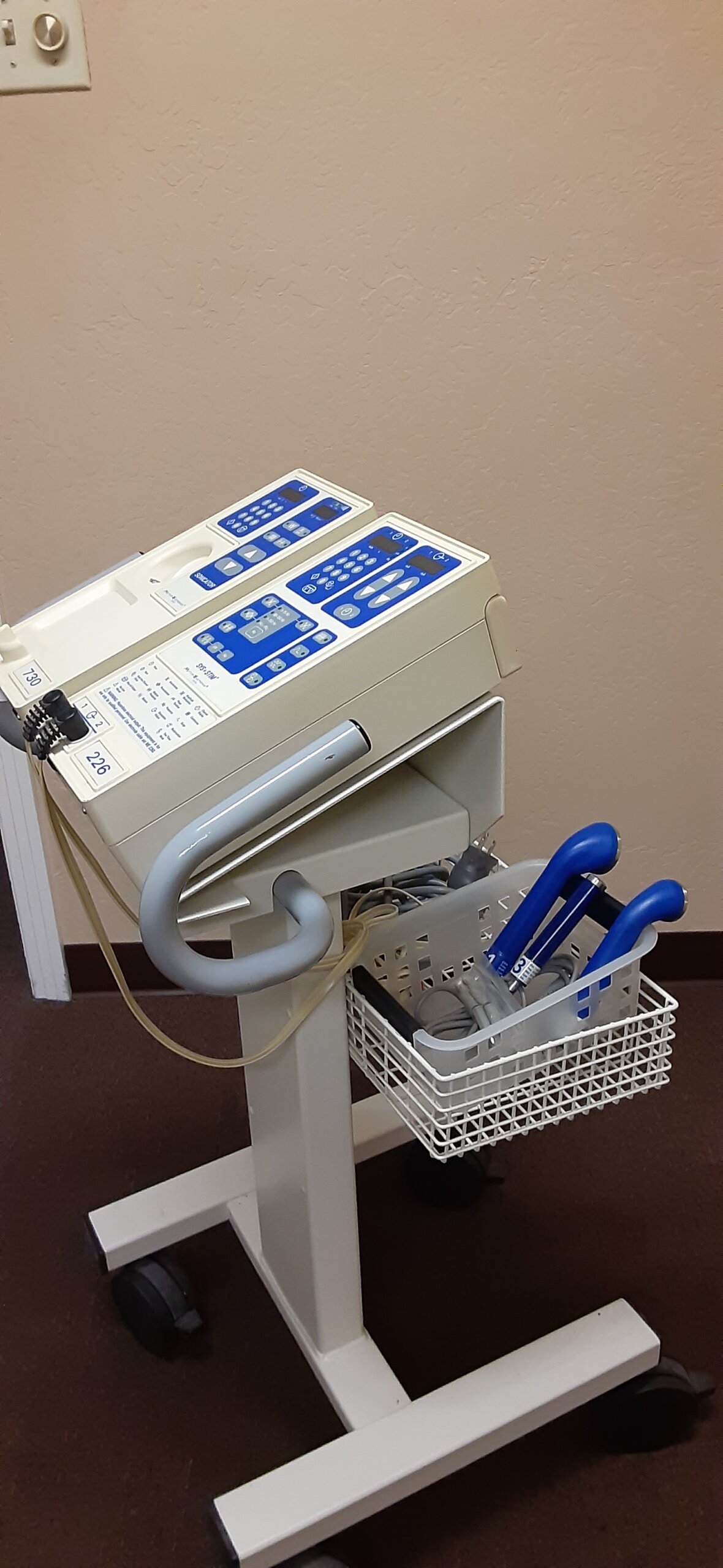 Mettler Sonicator ME 720 and Mettler Electronics Sys-Stim 226 in 2 unit rollig cart. All wands (ME7335, ME710 and ME7331), connectors and cords included.