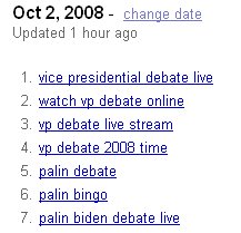 Before I left the office I printed out the hottest searches taking place around 6 p.m. Pacific time. Number one on that list was “vice presidential debate time” followed by “vp debate 2008 time” and then “palin biden debate time.” 3 volcanically hot searches all generally asking the same thing; what time is this event going to happen?