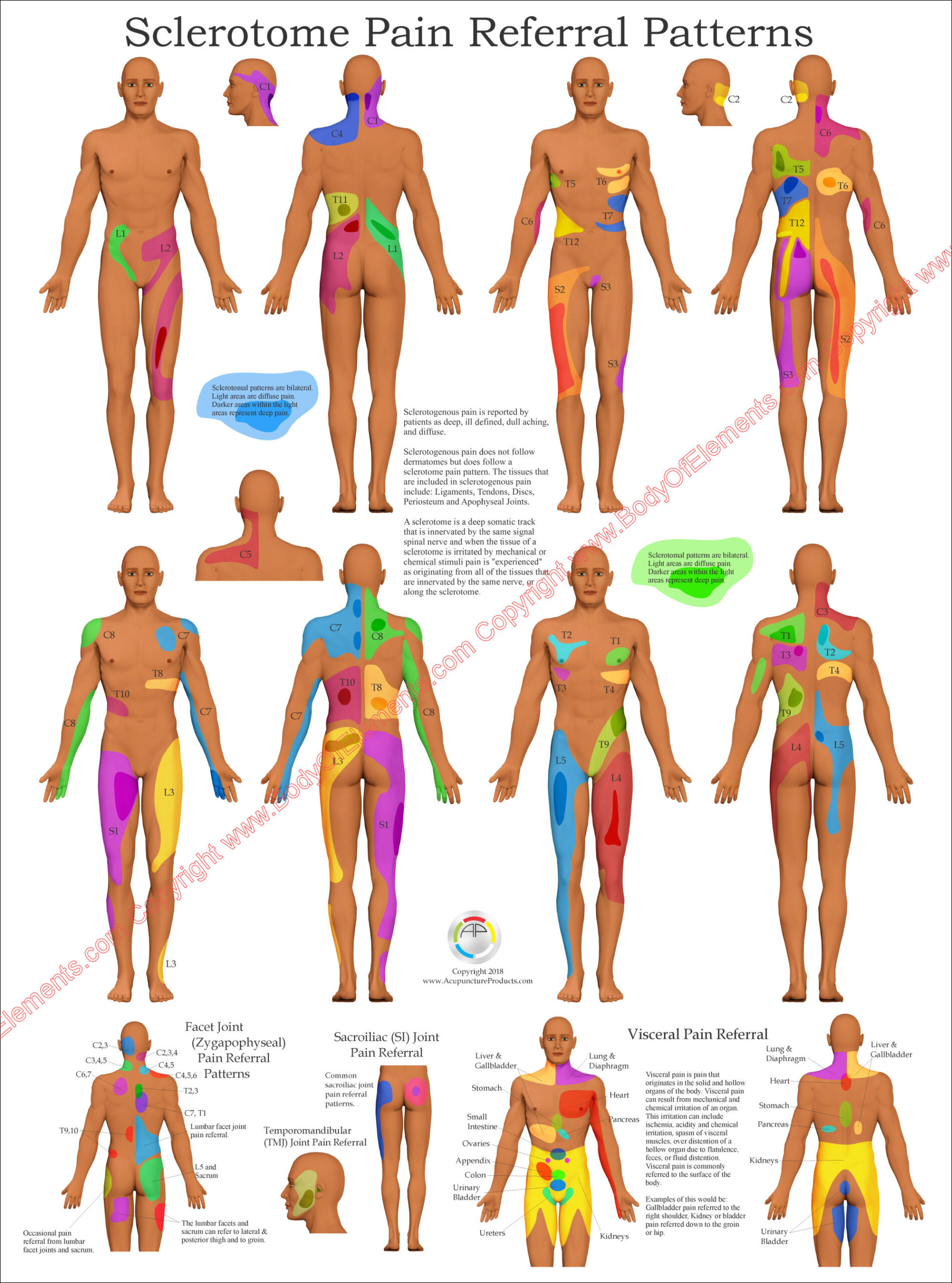 Sclerotome/Visceral Pain Referral Poster contains sclerotome pain referral from C1 to S3. Facet, sacroiliac and TMJ pain referral patterns.