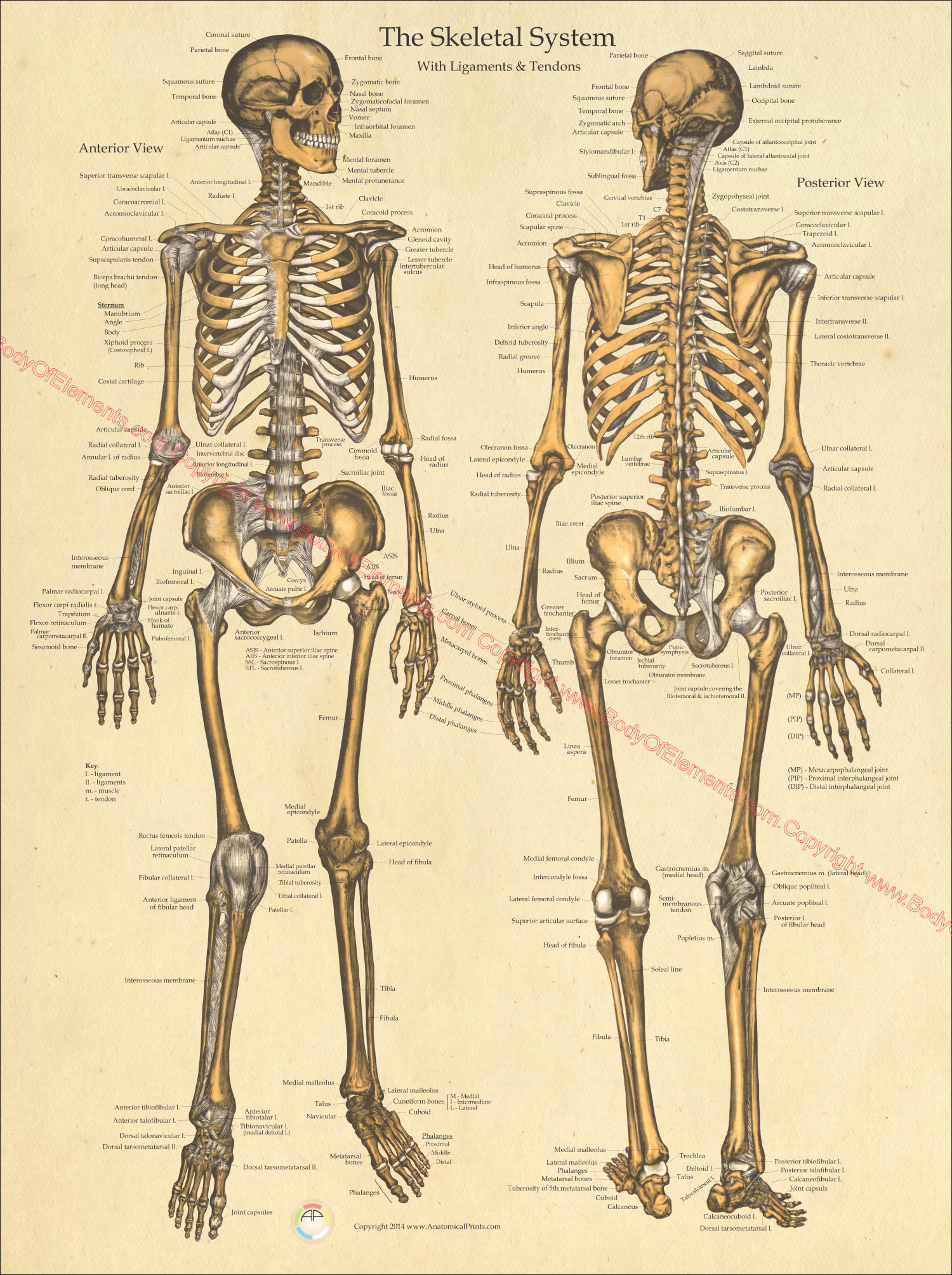 Skeletal anatomy poster with anterior and posterior views including ligaments and tendons. Bones of the skull and sutures. Ligaments and tendons of the joints of the sternum, spine, shoulder, pelvis, hands and feet. Labeled illustrations that are unique look for the clinic setting. Laminated or paper. – www.BodyOfElements.com
