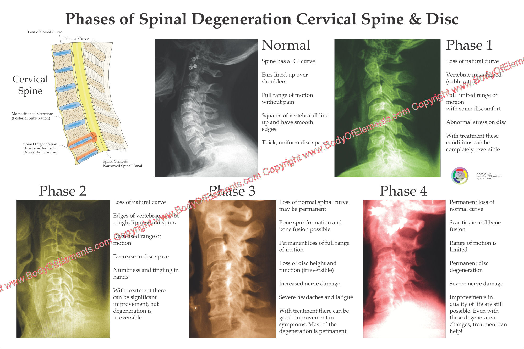 Spinal Degeneration Poster Cervical Spine 24″ X 36″ (Laminated or Paper) Radiology views of the cervical spine showing the 4 phases of spinal degeneration. Color coded to help explain xrays during report of findings with your patient. Common conditions are listed with each phase.
