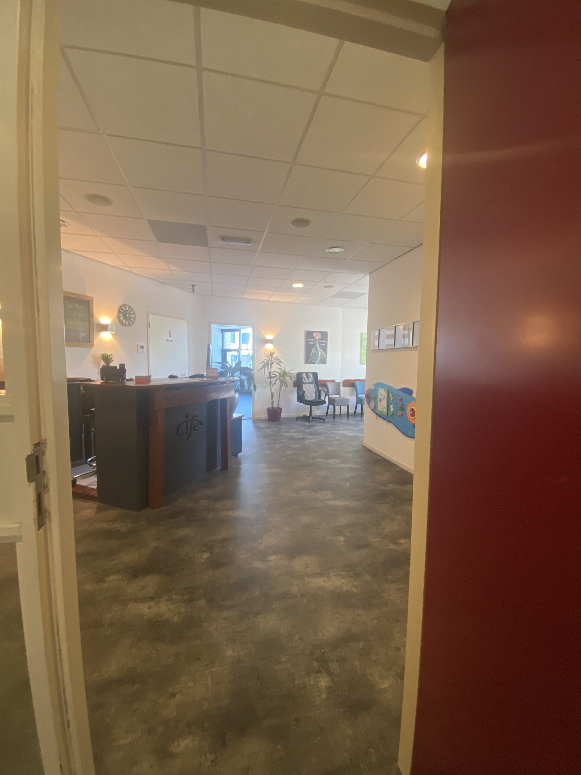 The practice is standing in an ideal location within a 10 minute walk of the city center and 2 minutes to the train station. There is an open plan room with 3 tables placed in a circular pattern 120 degrees apart and two closed adjusting rooms. One of these is equipped with a climbing wall and proprioceptive training for children. The office manager has been with the practice for more than 15 years and we also have a new assistent since the summer.