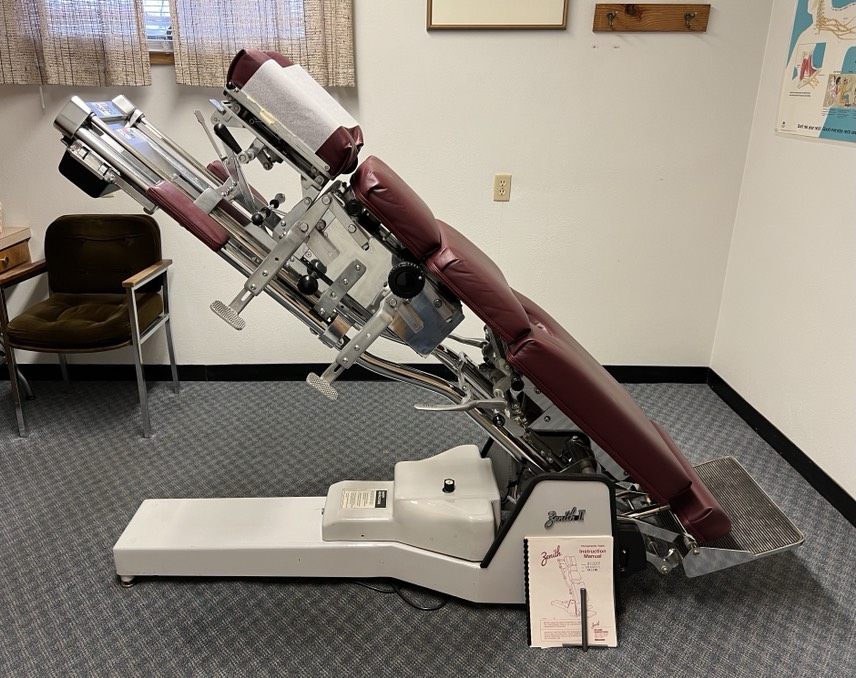 Zenith model 320 Hi Lo table Serial number BM68032 purchased 2/14/1994 for sale. Drop sections on pelvic, lumbar, thoracic, and cervical sections. All sections are
